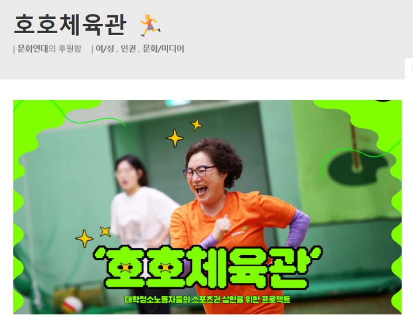 '호호체육관'은 고된 노동에 시달리는 대학청소노동자들이 스포츠를 통해 자기의 몸과 삶에서 즐거움과 놀라움을 찾아가고, 소속 대학 학생 및 시민사회와 서로 연대할 수 있는 발판을 마련하는 프로젝트입니다.